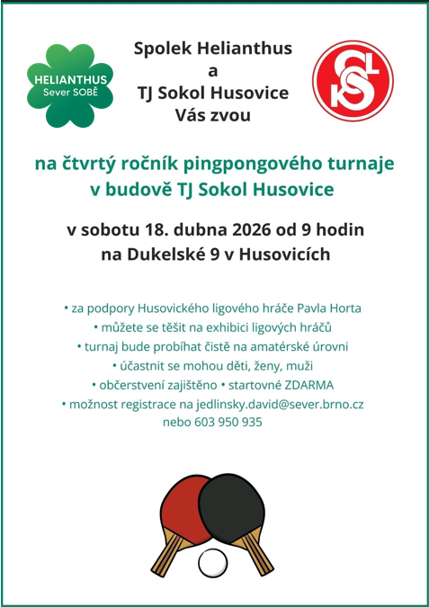 Helianthus v čele s Davidem Jedlinským vás zvou na nesmírně atraktivní akci, úklid Husovic. Co z toho? Dobrý pocit, vzor ostatním a čistší prostranství. Přijďte! Sever SOBĚ!